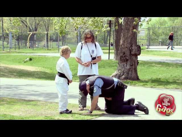 http://gags.justforlaughs.com | Subscribe: http://goo.gl/wJxjG Little karate kid with black belt gets annoyed at a stupid cop for making fun...