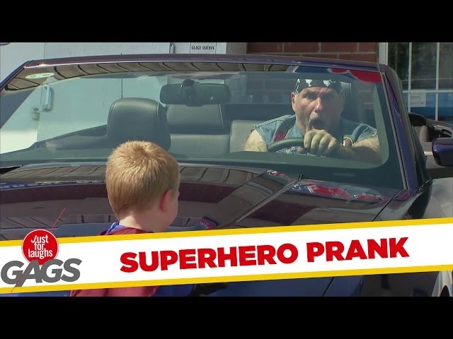 http://gags.justforlaughs.com | Subscribe! http://goo.gl/wJxjG A burglar is foiled by a little kid dressed in a superhero outfit. Onlookers are...