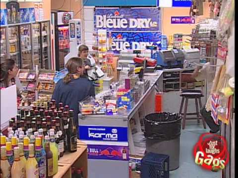 http://gags.justforlaughs.com | Subscribe! http://goo.gl/wJxjG A completely insane corner store attendant goes crazy when clients wake him up. He is...